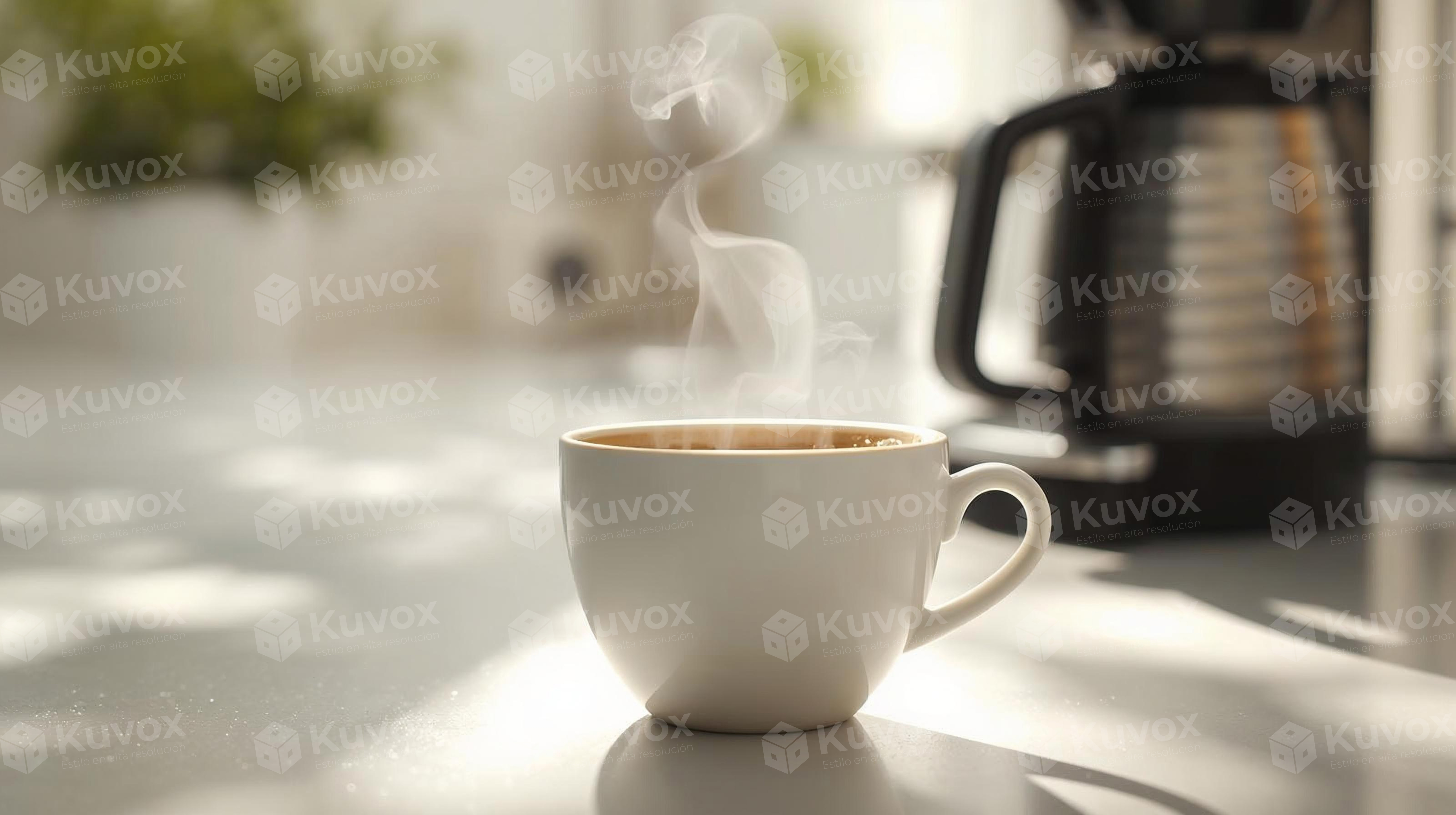 A steaming cup of coffee on a lighted table in the morning. Scene that evokes calm, aroma and everyday comfort.