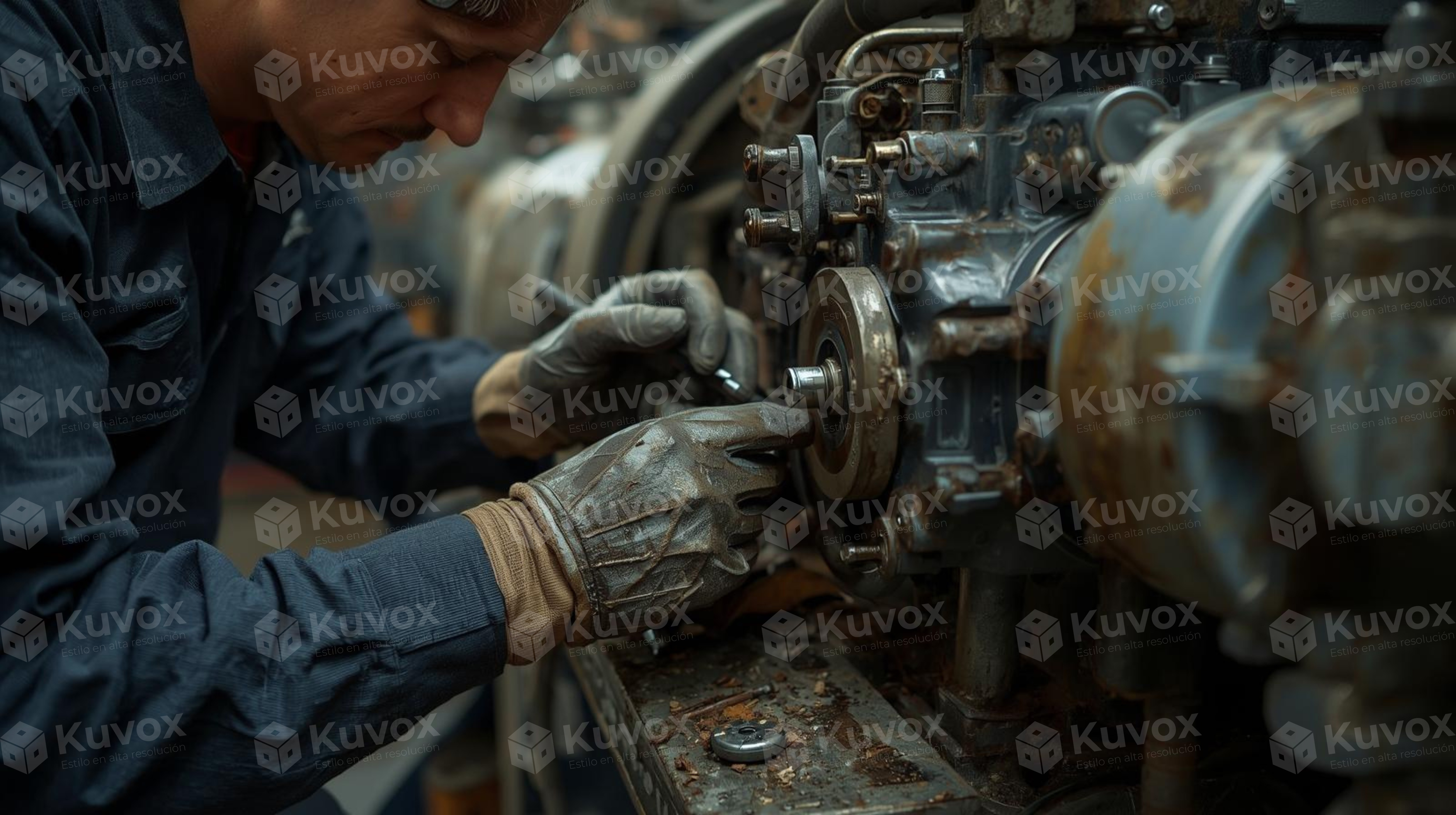 Concentrated technician repairing heavy machinery, showing realistic detail and texture.