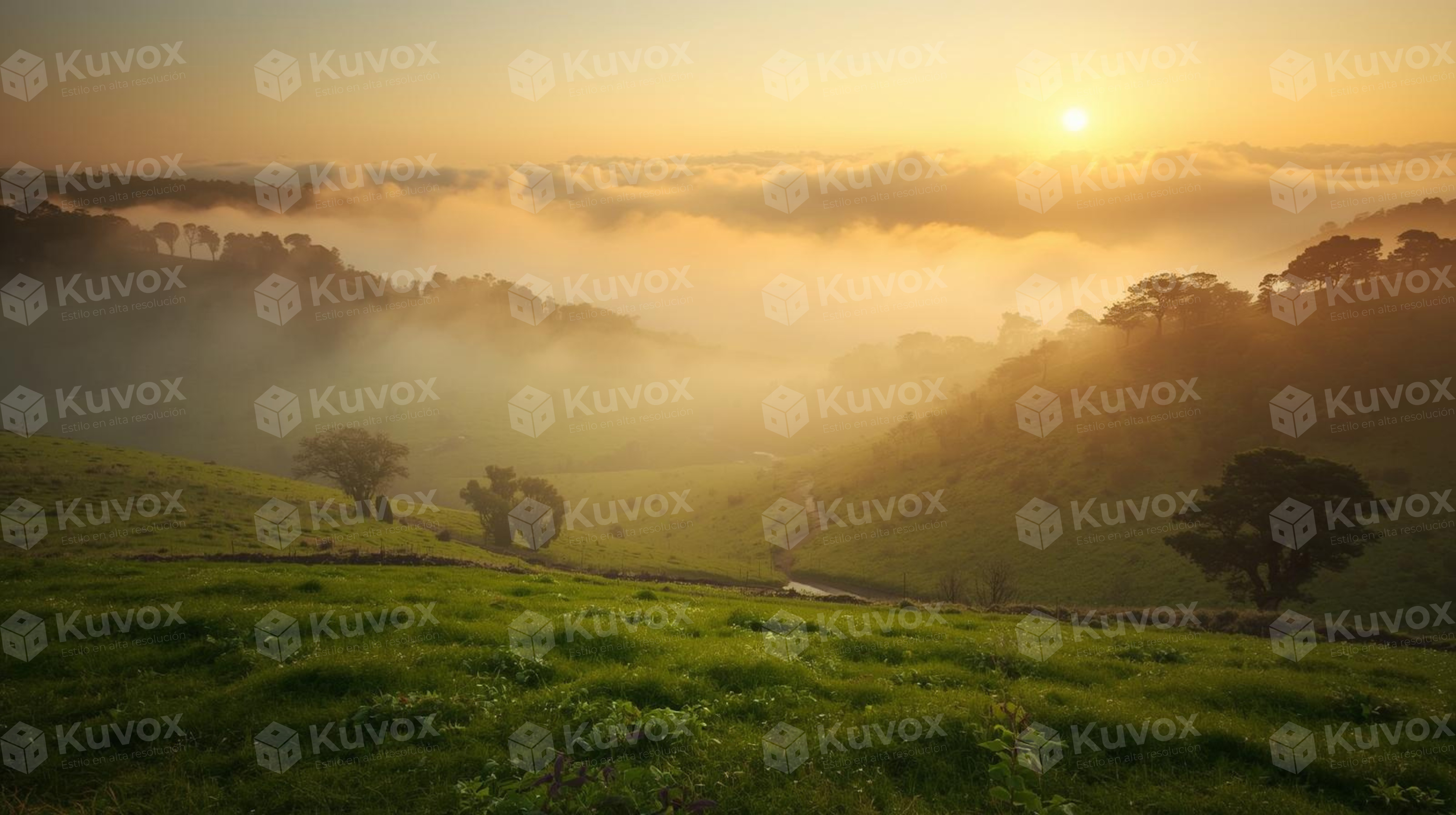 The morning light breaks through a soft mist over the green meadows. Image that transmits freshness and tranquility.