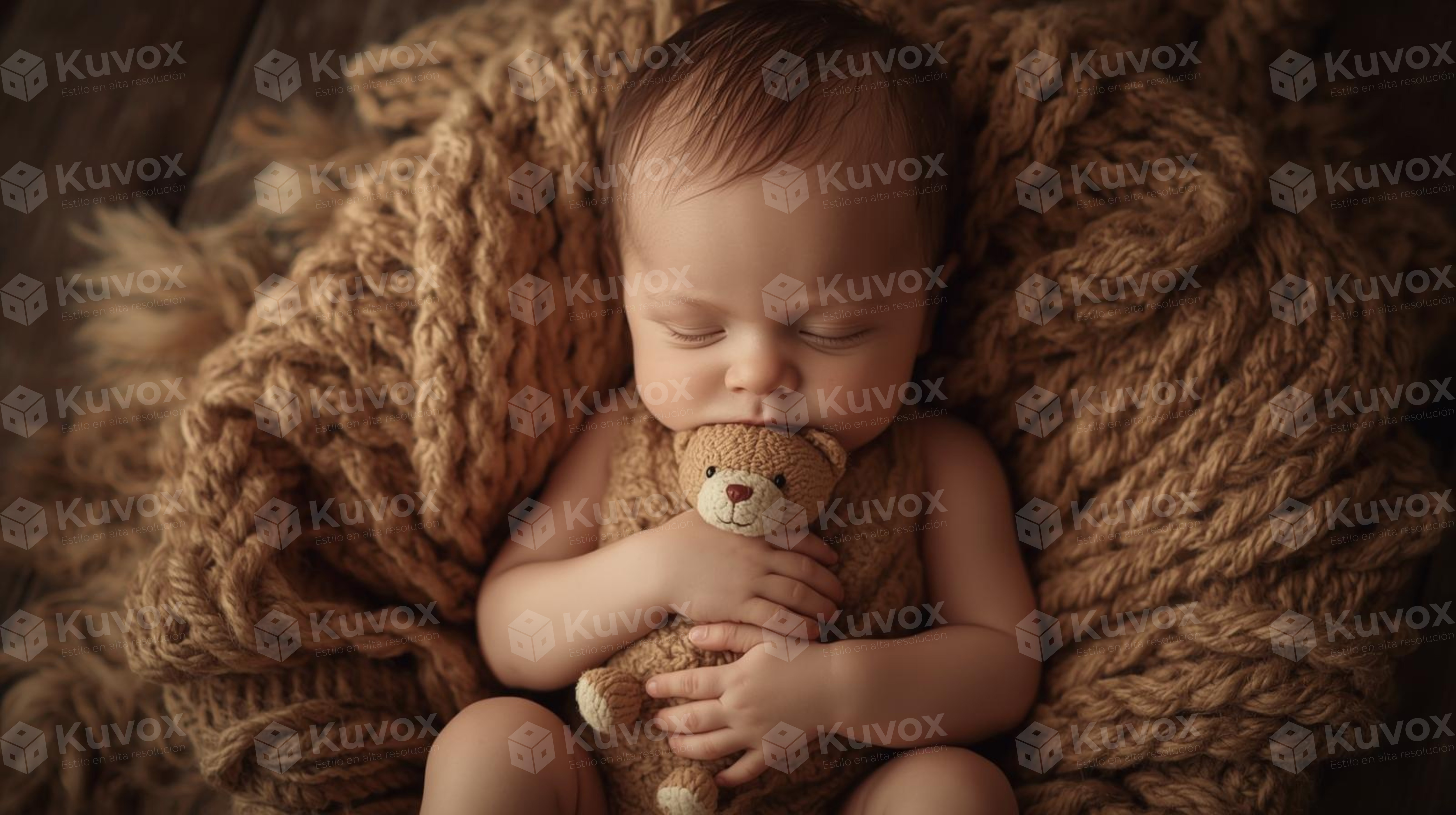 Bebé abrazando un pequeño oso de peluche con una expresión de calma y amor.