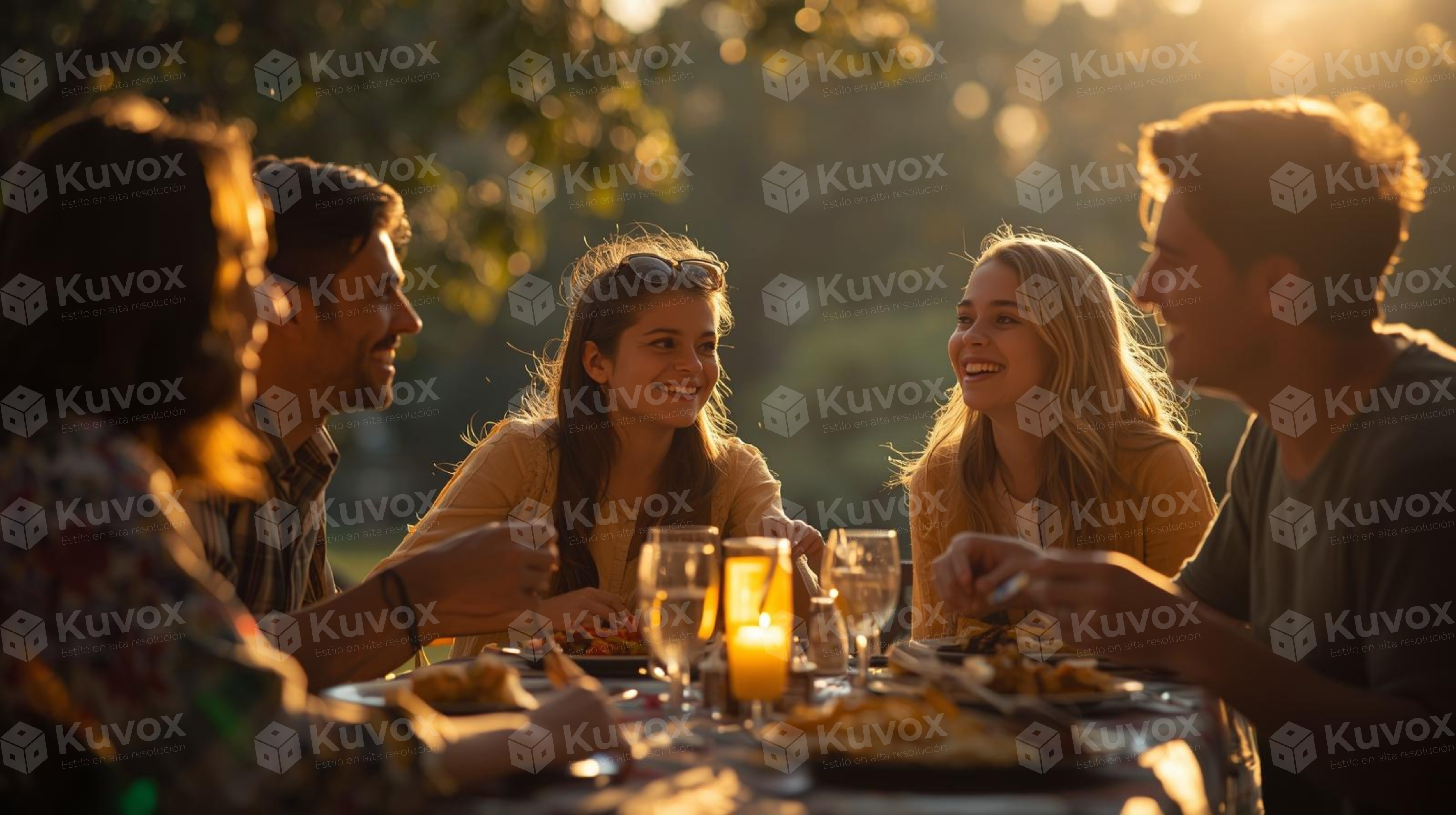 Grupo de amigos riendo alrededor de una mesa iluminada por el sol del atardecer. Representa conexión, alegría y momentos compartidos.