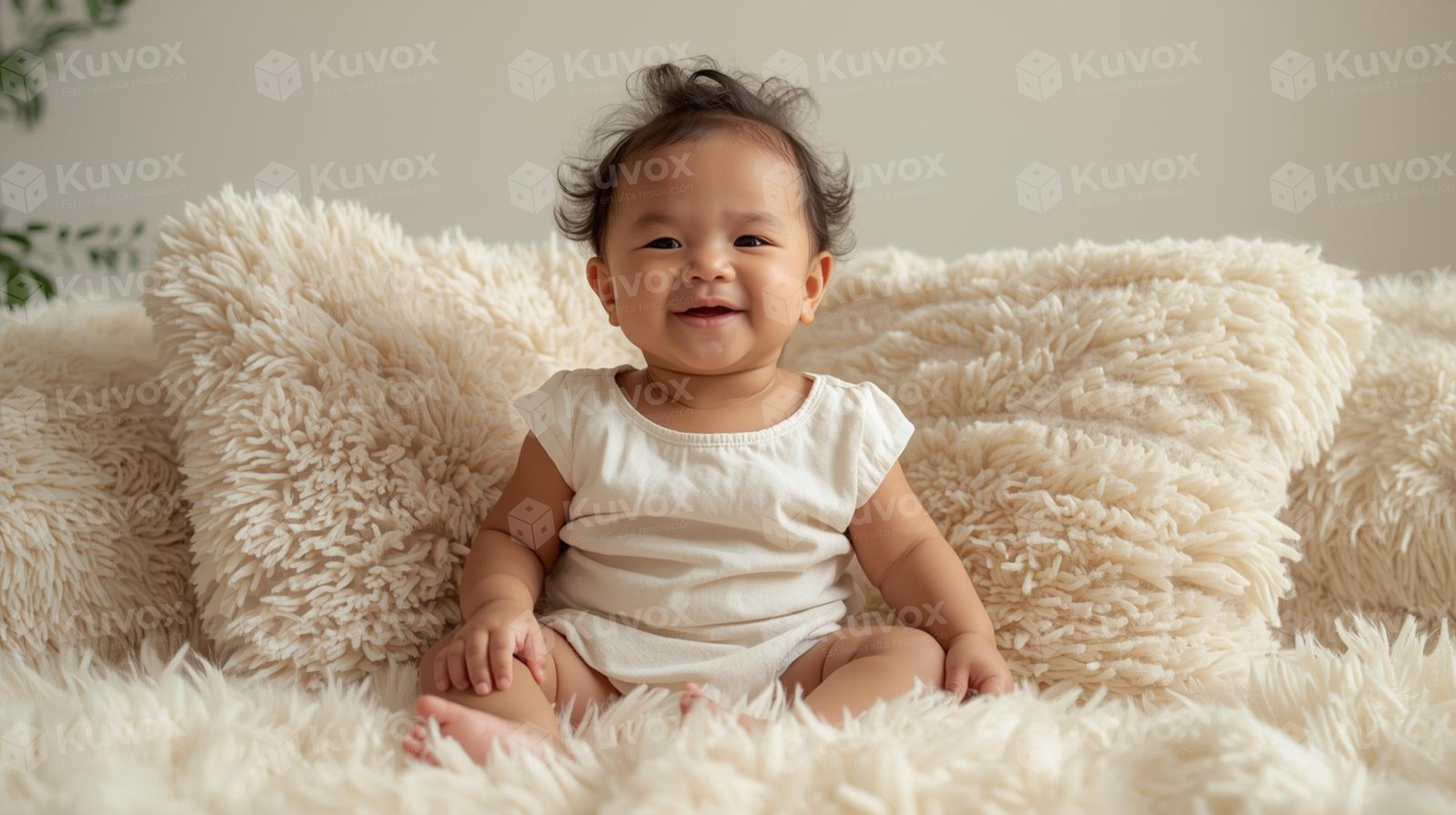 Bebé de rasgos asiáticos sonriendo sobre una mesa de madera, con luz natural y fondo cálido.