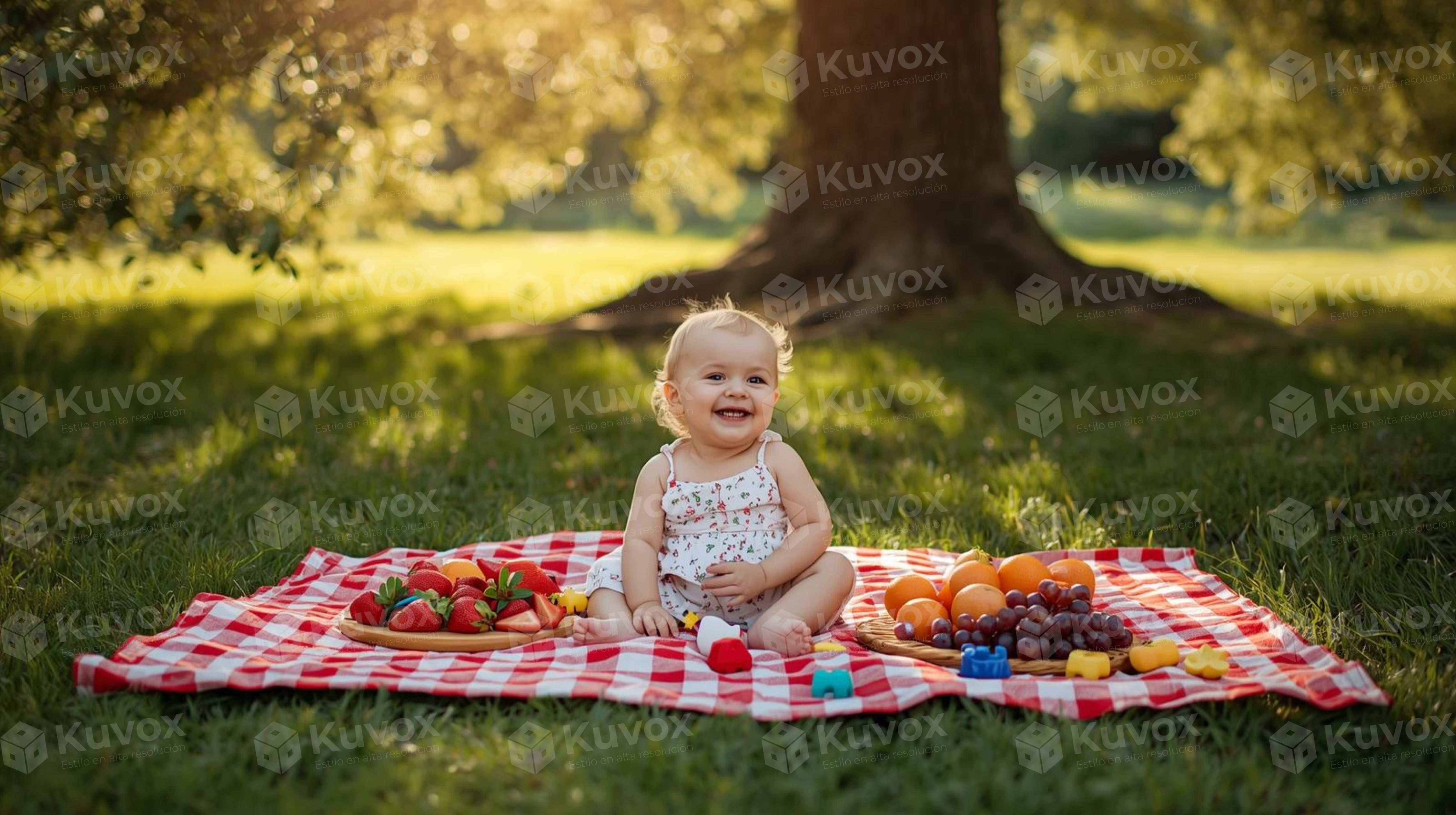 Bebé sentado sobre una manta en un picnic bajo un árbol, con luz solar y colores naturales.