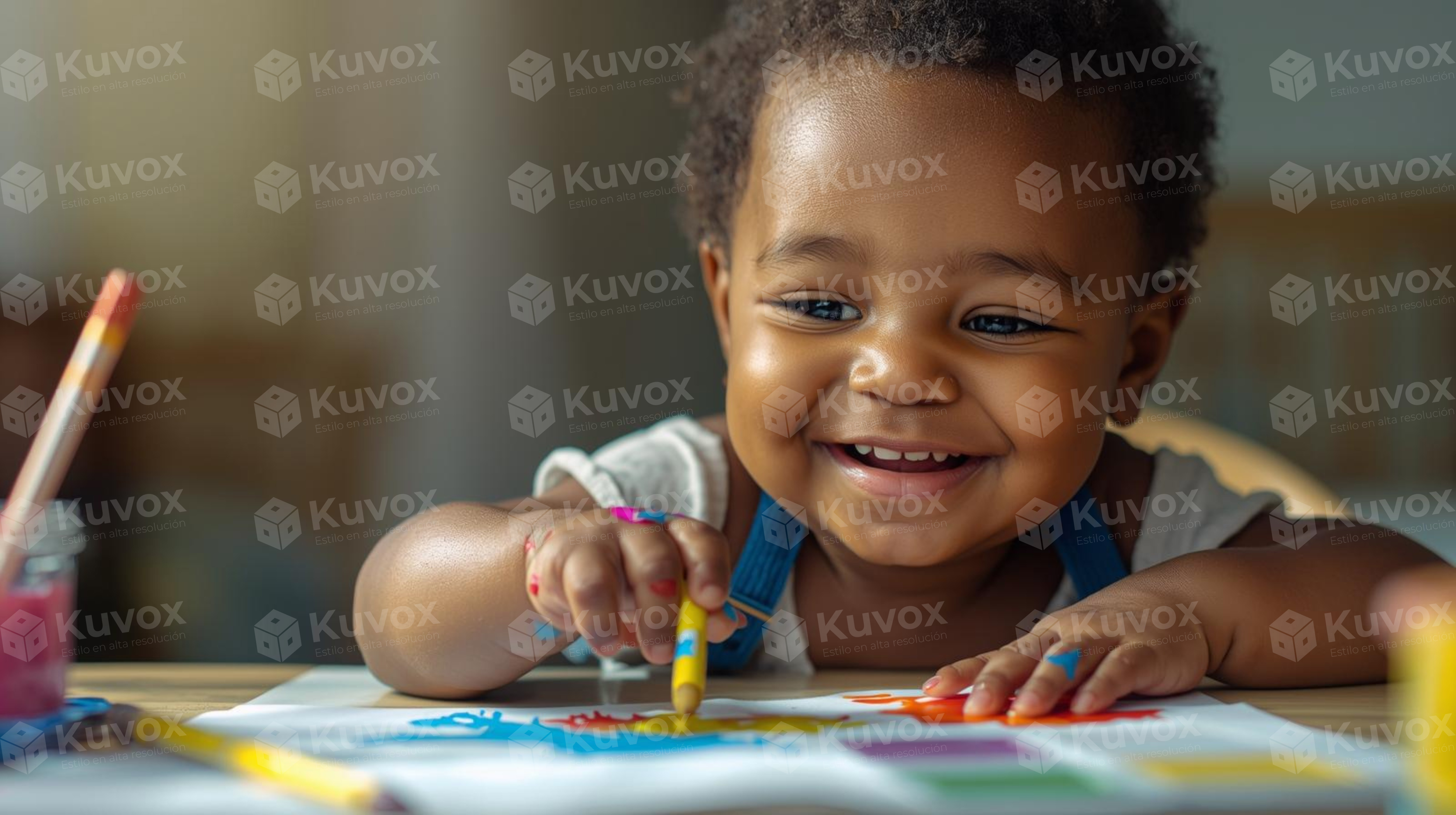 Bebé con las manos manchadas de pintura, disfrutando de un momento artístico y alegre.
