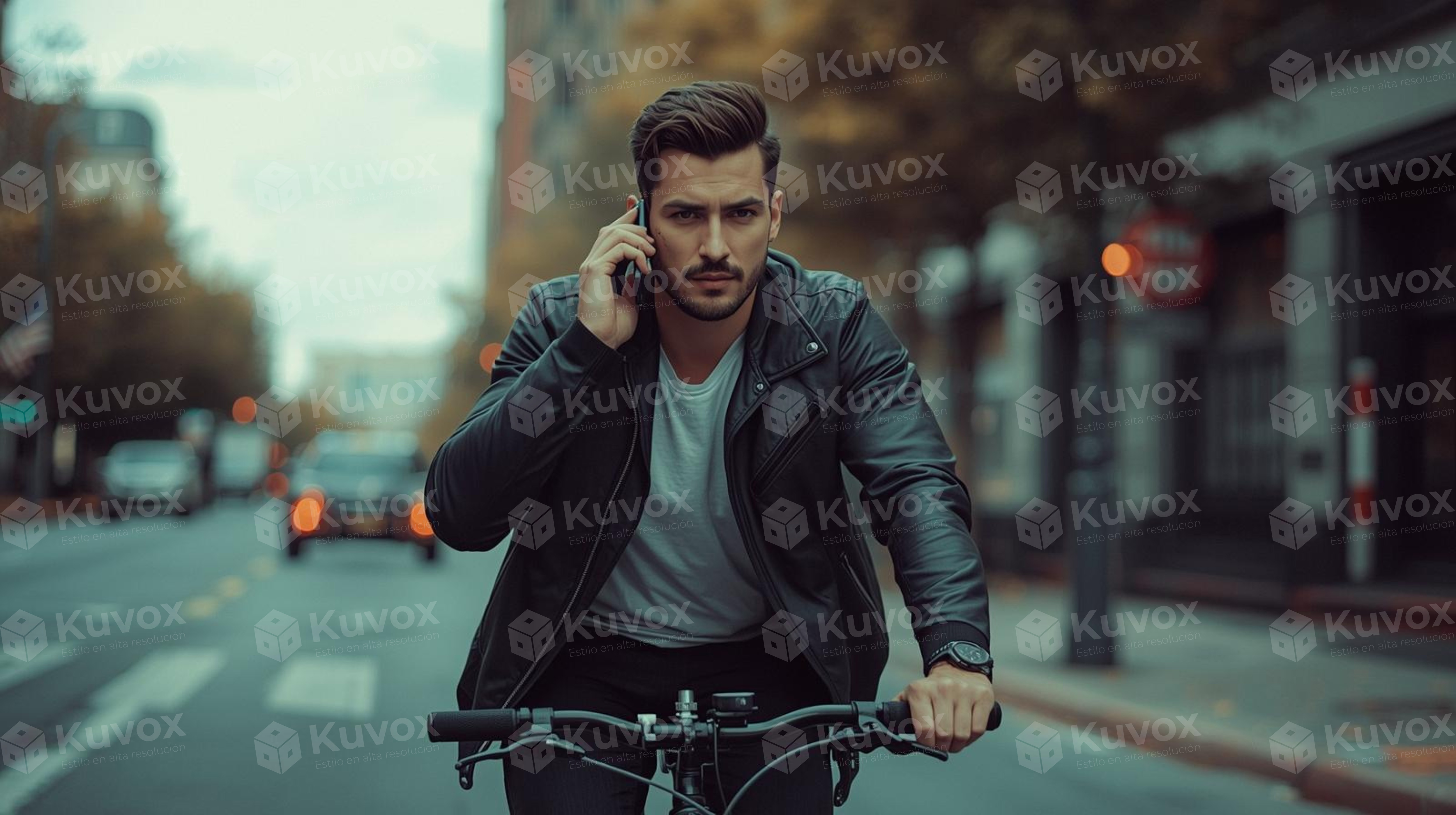 Un hombre pedalea por la ciudad mientras habla por teléfono. Imagen que refleja dinamismo, equilibrio y estilo moderno.