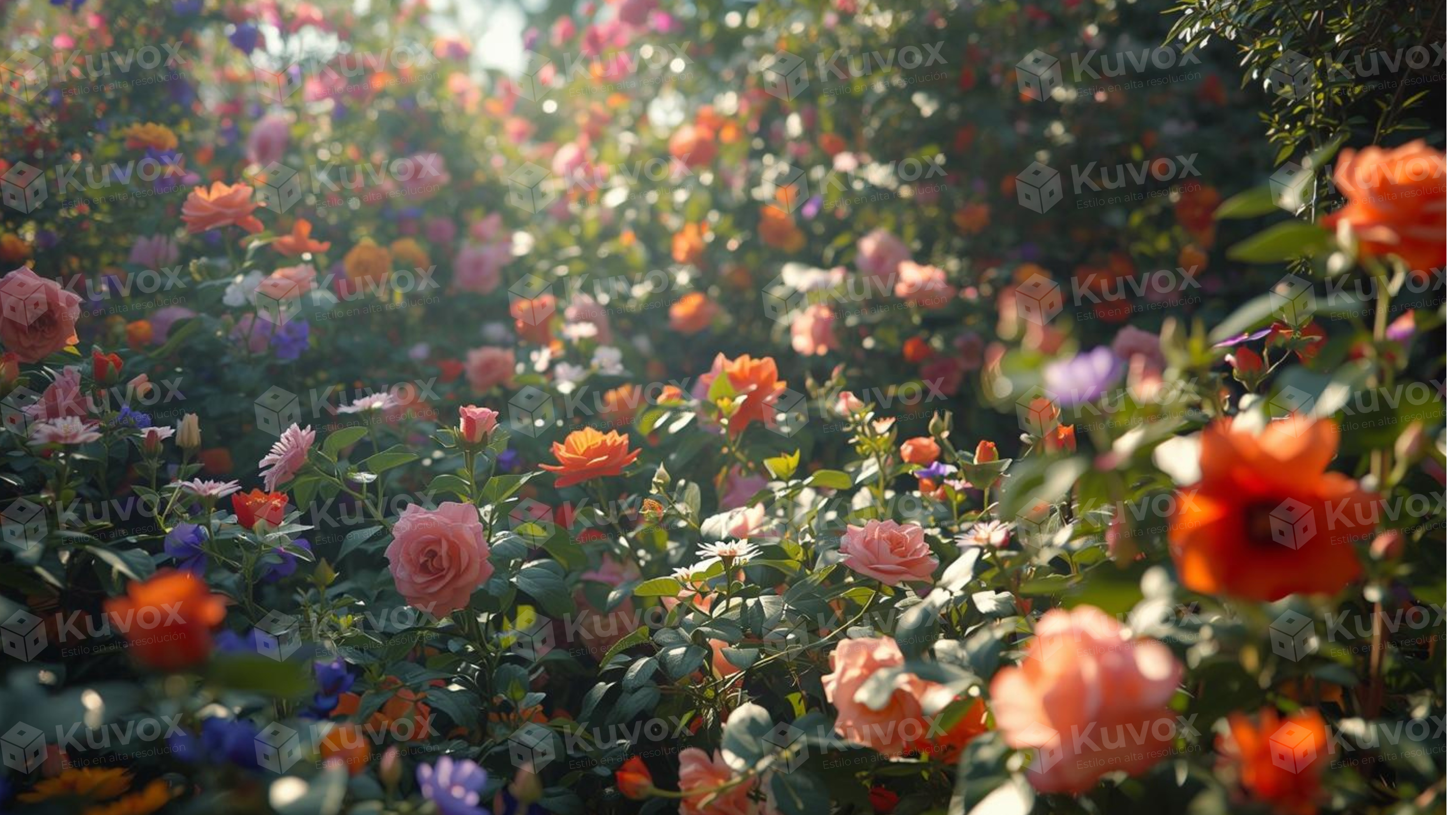 Rosas de distintos tonos llenan el jardín con color y fragancia. Una escena exuberante que celebra la diversidad floral.