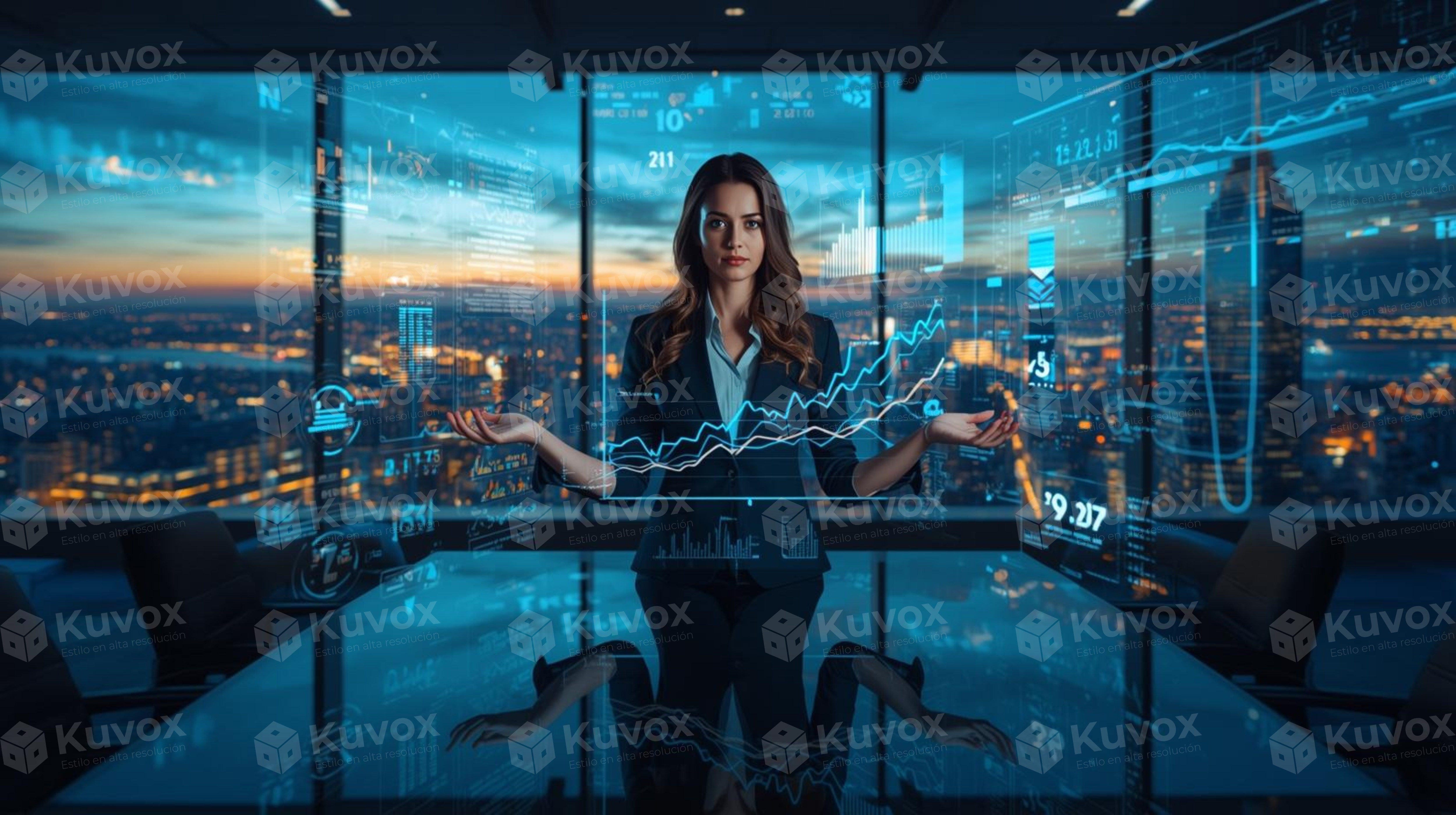 Ejecutiva observando proyecciones de datos sobre el crecimiento de una empresa tecnológica desde un rascacielos.