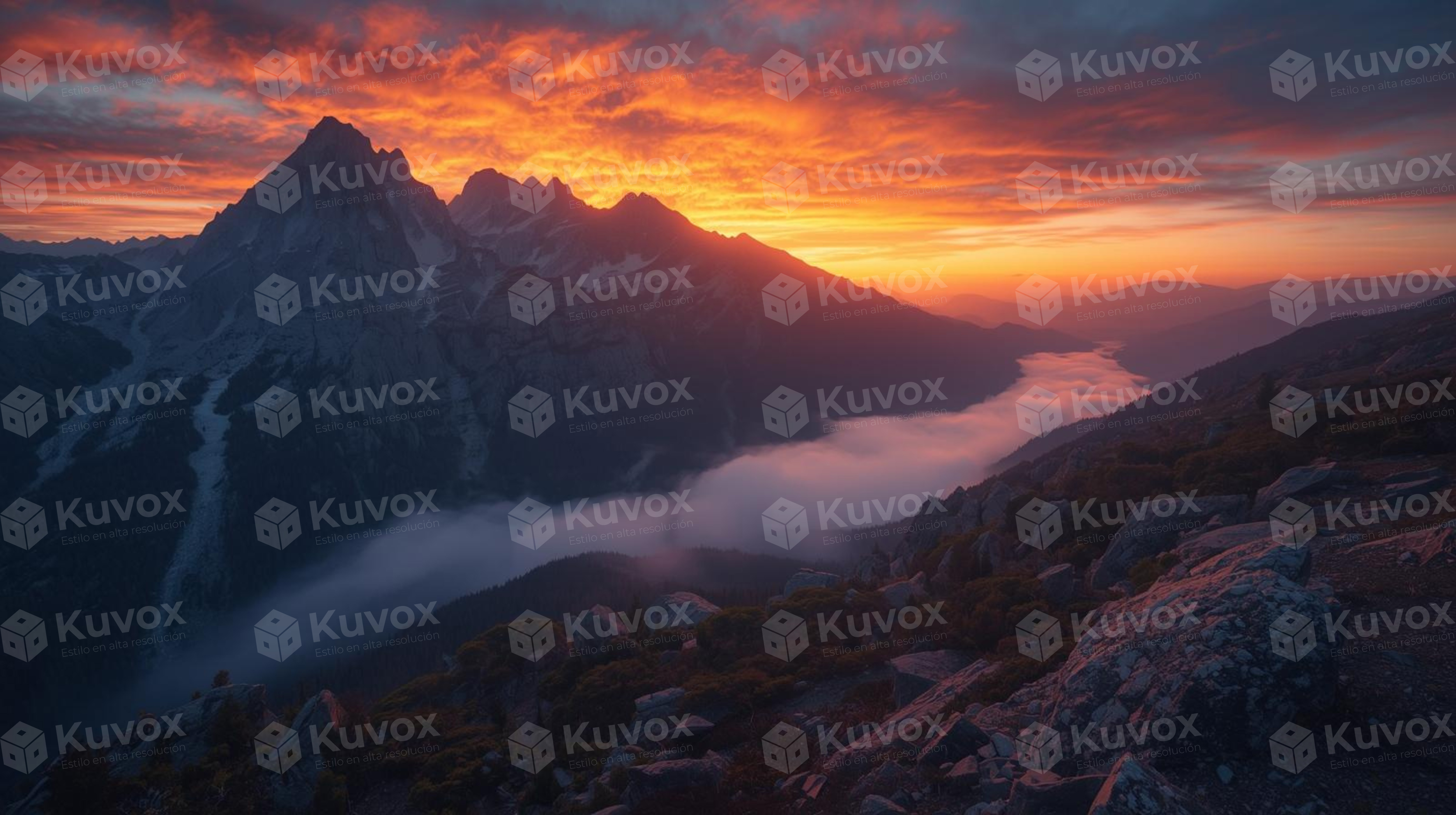Montañas iluminadas por los primeros rayos del amanecer, rodeadas de nubes color fuego. Un paisaje épico lleno de energía natural.