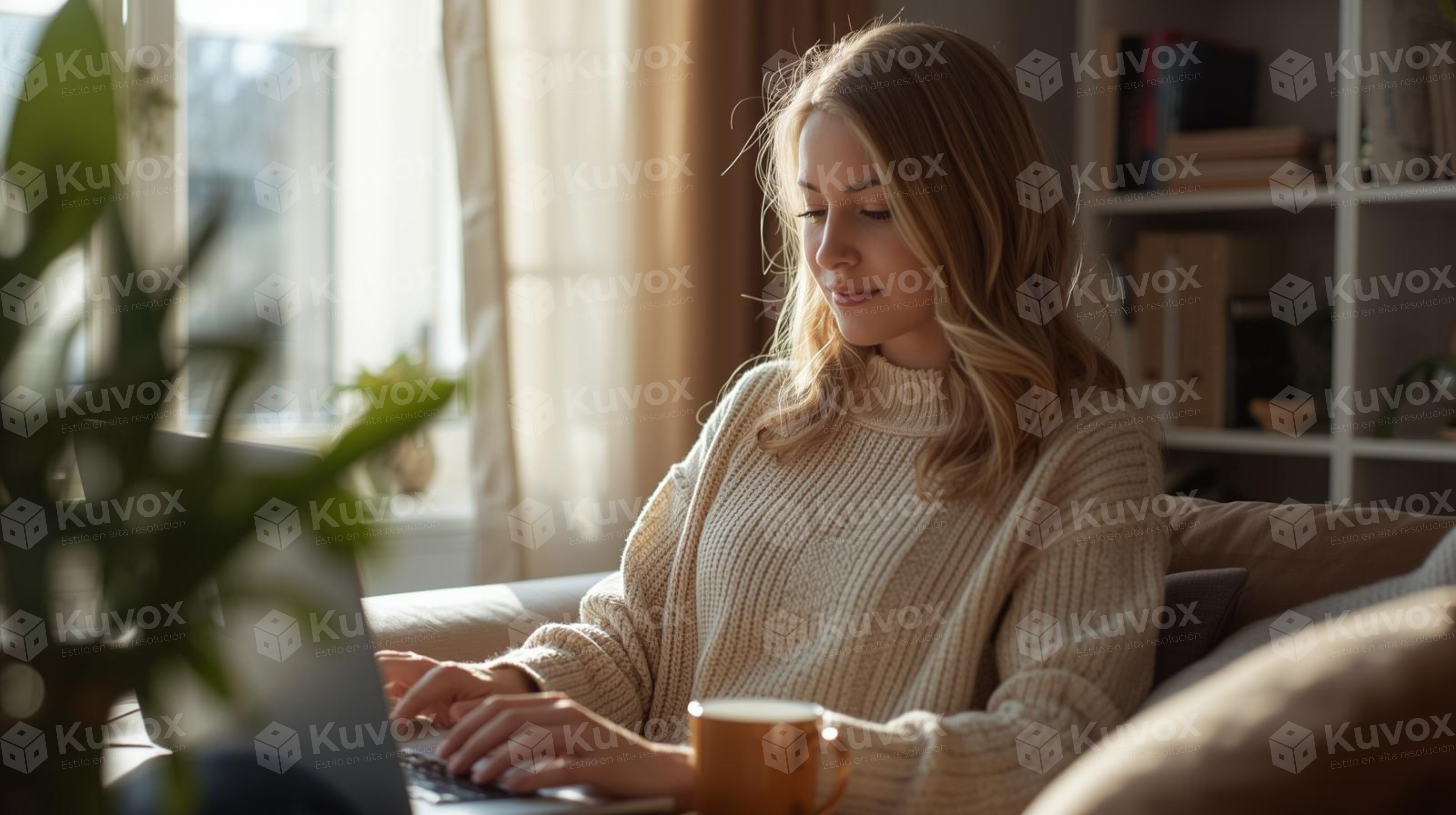 Una joven trabaja desde casa rodeada de luz natural. Escena que representa productividad, creatividad y confort moderno.
