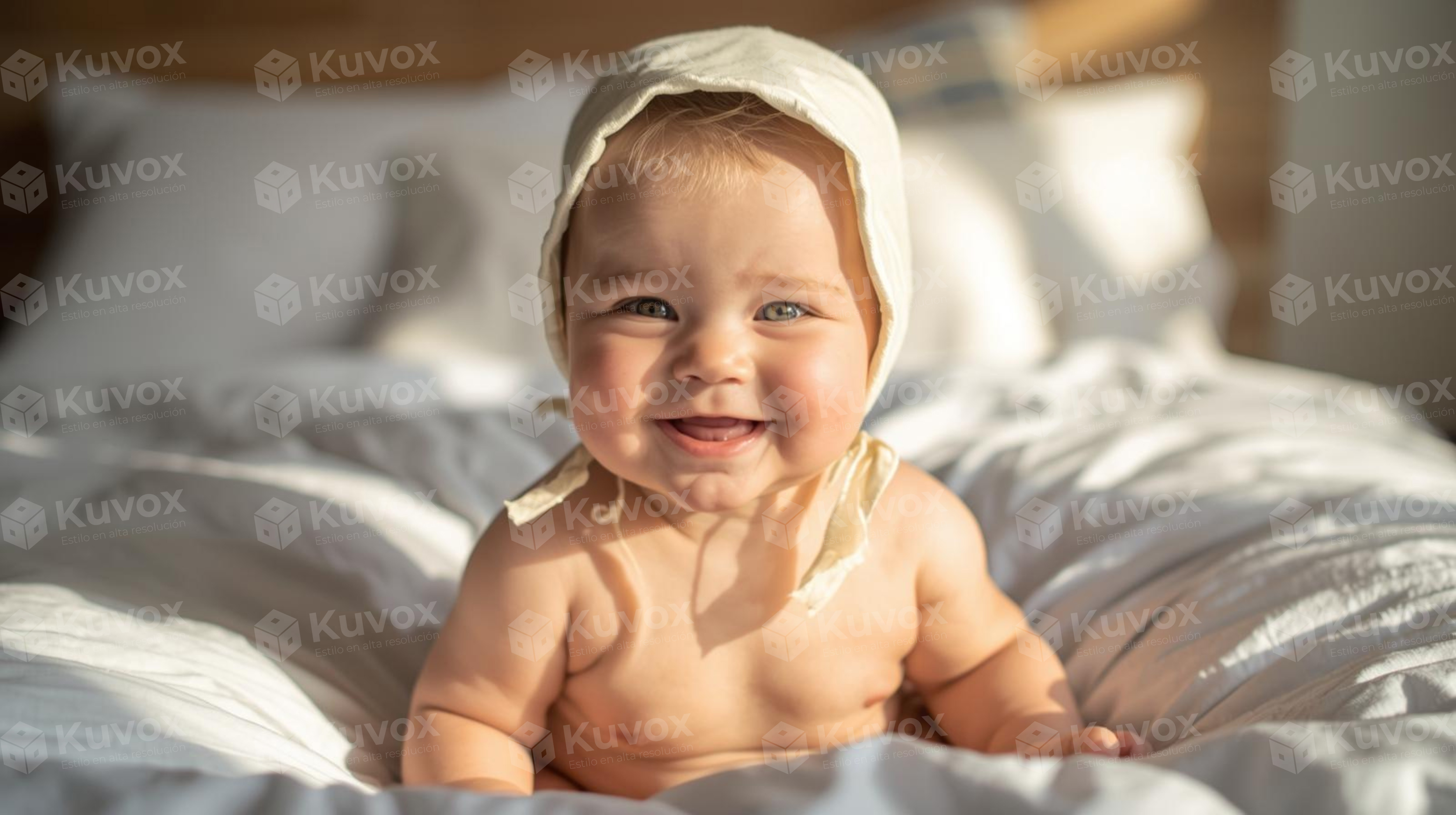Bebé sonriendo ampliamente con gorro blanco, mostrando una expresión de alegría pura.