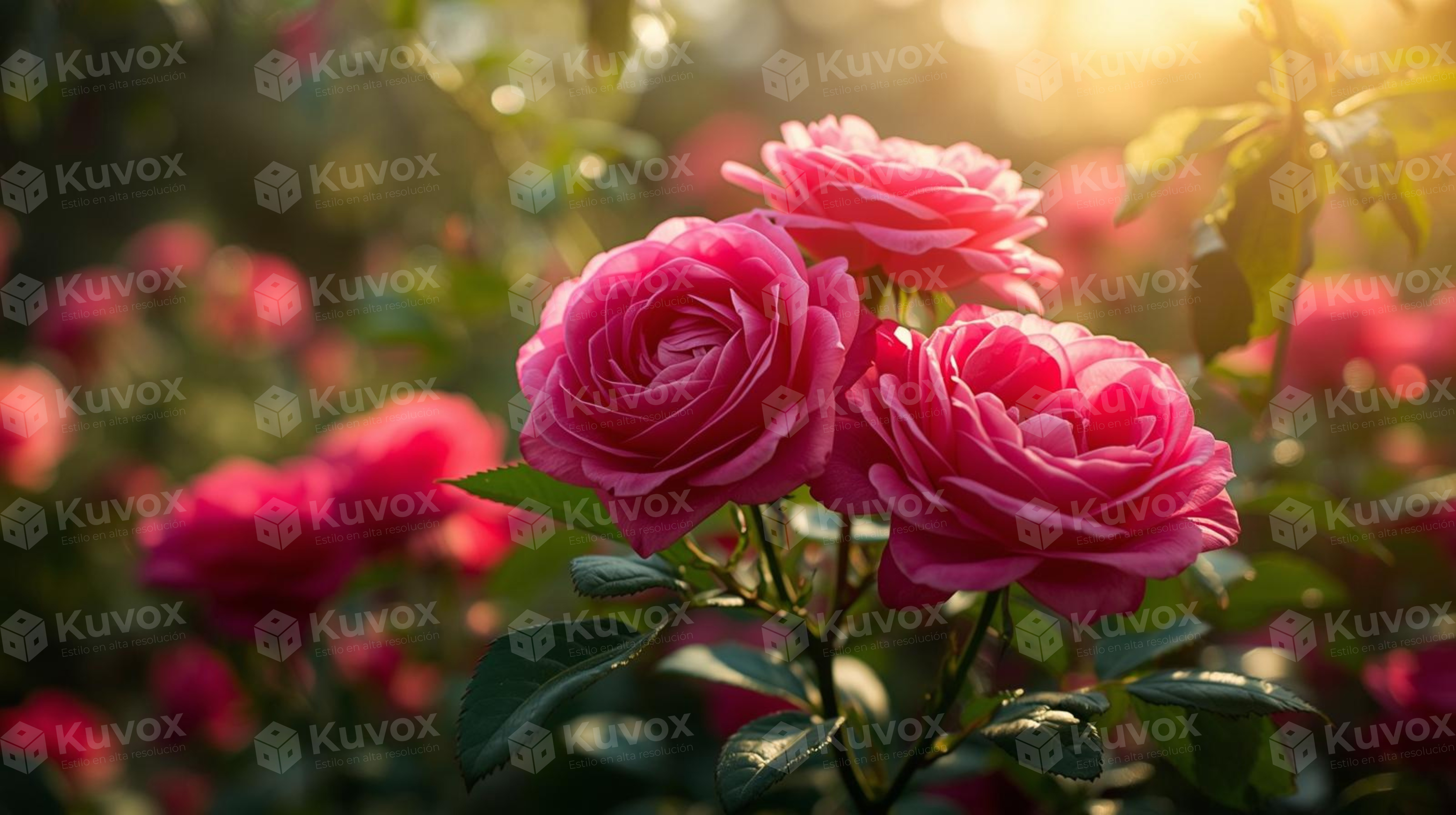 Rosas rosadas bañadas por la luz cálida del atardecer. La suavidad de los tonos evoca romanticismo y serenidad.