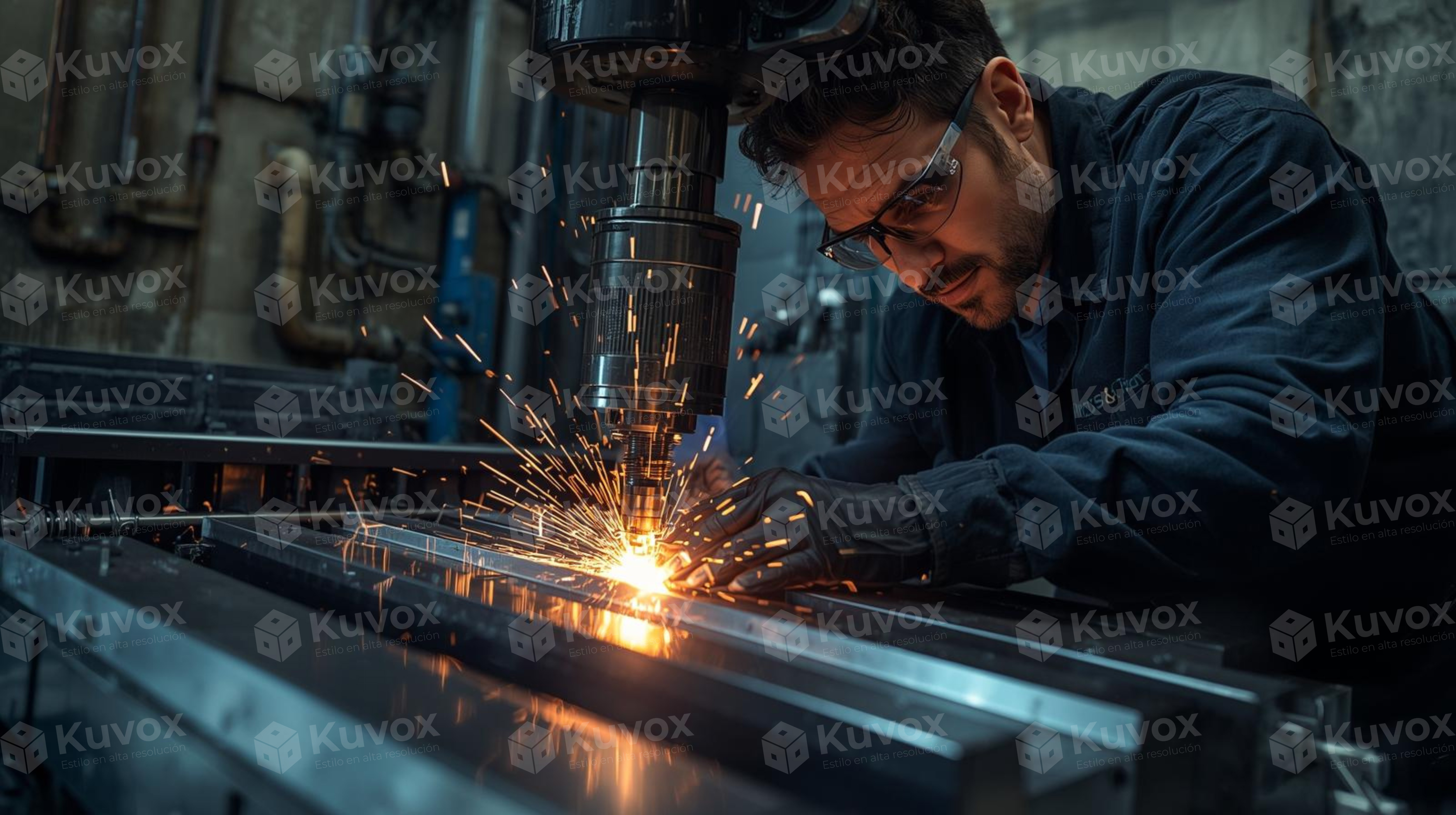 Un soldador concentrado con chispas volando, representando precisión y esfuerzo humano en la industria.
